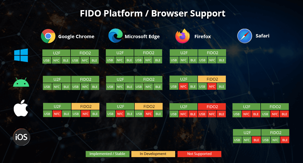 Hideez Key supports passwordless authentication standards (FIDO U2F and FIDO2) developed by the FIDO Alliance. FIDO specifications are currently supported by over 300 popular websites and applications in Google Chrome, Mozilla Firefox, Microsoft Edge, and Apple Safari web browsers.
