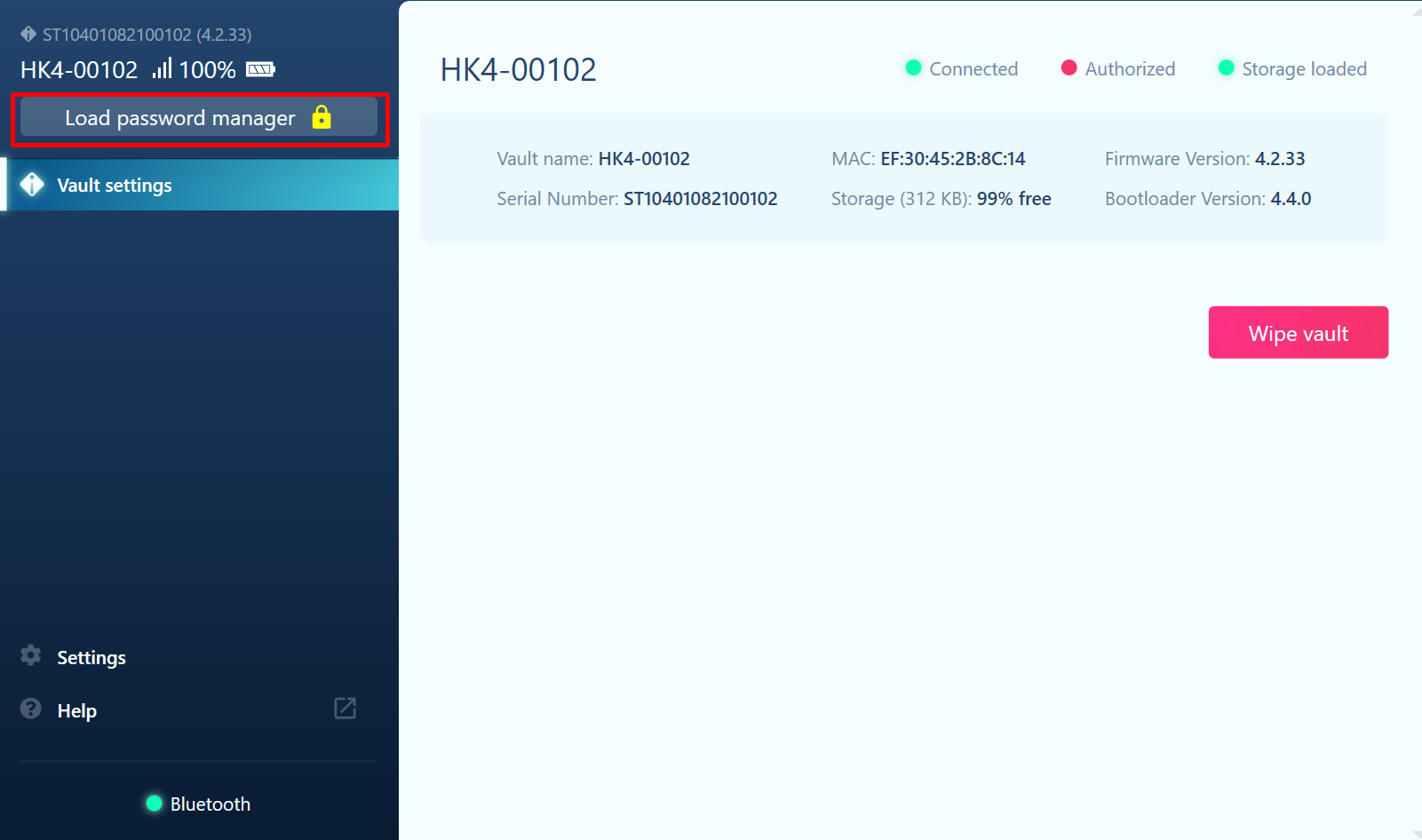 After updating the firmware, click the "Load password manager" button in the upper left corner to access the Password Manager. You will be required to enter the master password you created during the initial setup.