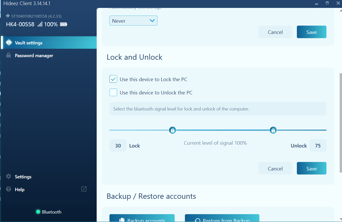 To automatically lock your computer when you step away from it, check the “Use this device to lock the PC” box in the Vault settings. You can adjust the distance you need with a slider. Your desktop will be locked when the Bluetooth signal level falls below the specified value in % and unlocked when the Bluetooth signal level exceeds the specified value in %.