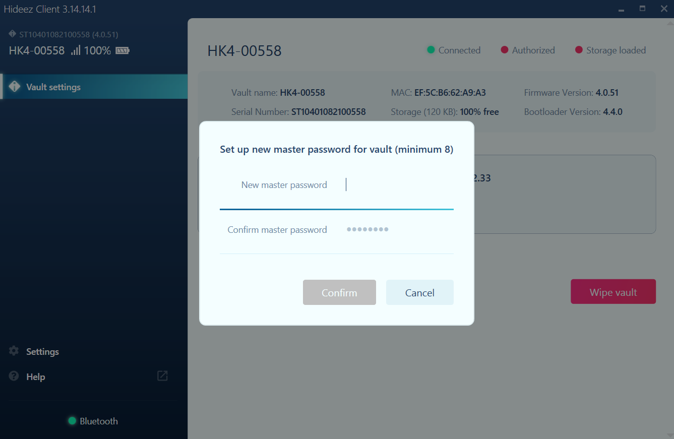 Once you open the Hideez Client, it will recognize the connected device and prompt you to create a master password. The password must be longer than 8 characters (letters, numbers, and special symbols). You can change your master password later on, but be sure to remember it.