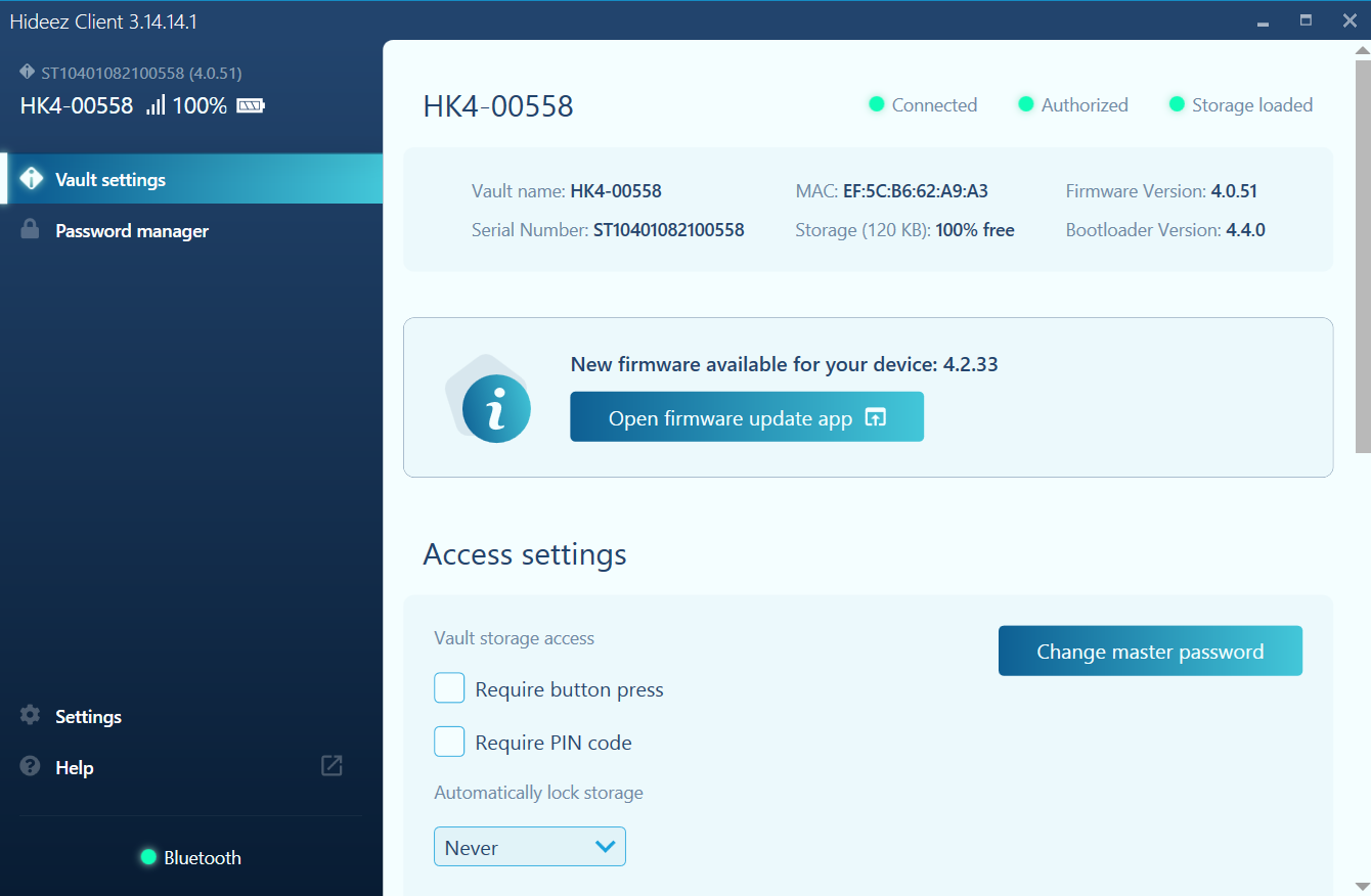 Once the Hideez Key is paired with your PC and authorized in the Hideez Client, you will be able to update the device firmware to the latest available version. Open the Firmware update app and follow the on-screen instructions.
