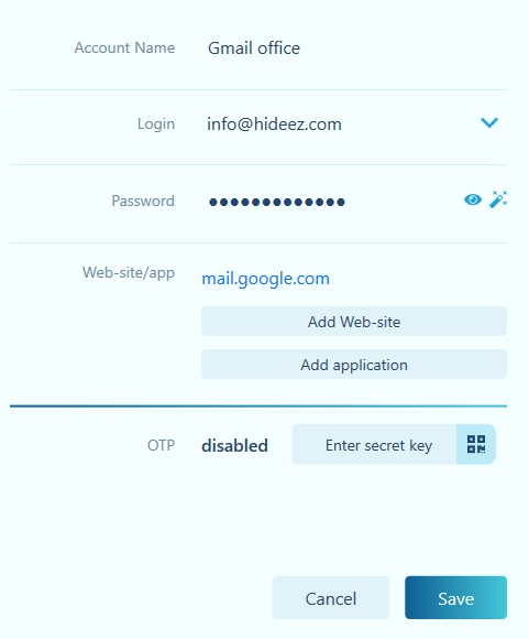 OR use a shortcut Ctrl + Alt + A to open a window for adding an account from an application or site. In this case, the account name and application / site fields will be pre-populated and can be edited.
