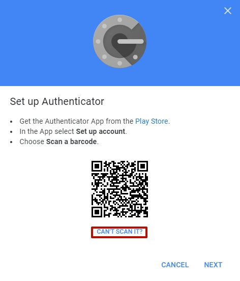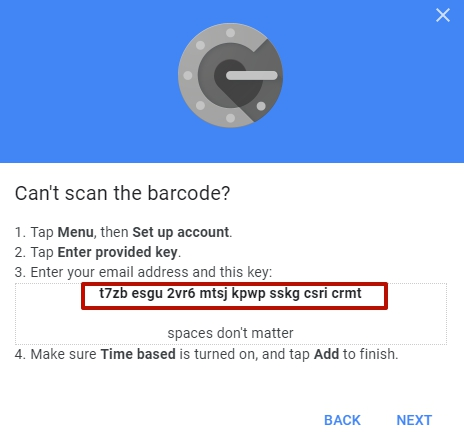 You can also add the secret manually. In this case, you will need to click on the link "CAN'T SCAN IT?". A window will open in which the same code will be presented in text form: