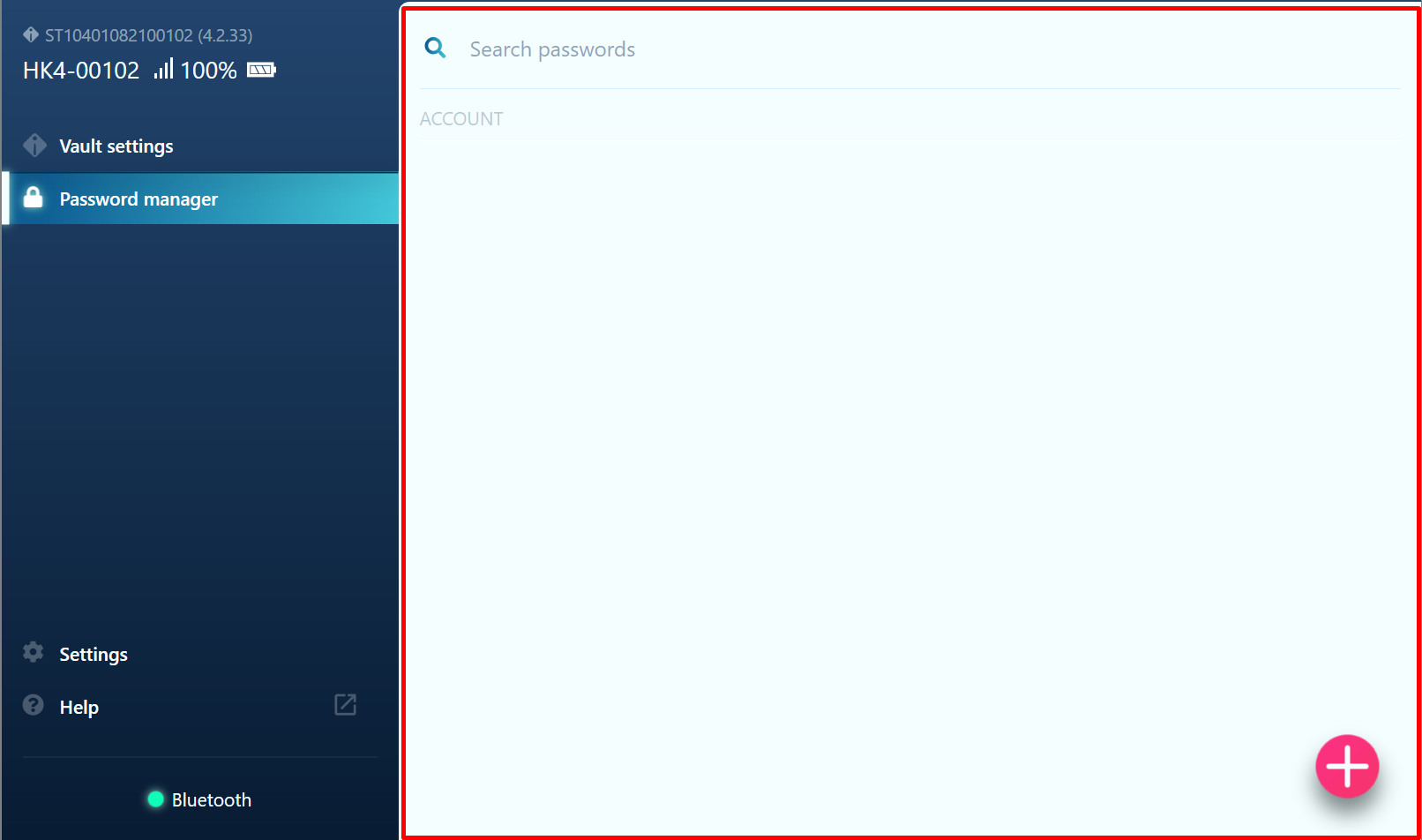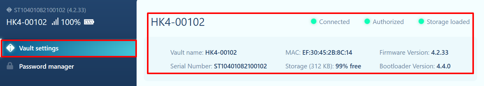 Storage loaded – the status of data load from the key. The green indicator means that the key is authorized, the data is uploaded and the Password manager menu item is available. A red indicator means that the key cannot pass authorization.