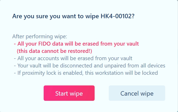 Wipe is a process of complete and irrevocable data deletion from your Hideez Key.