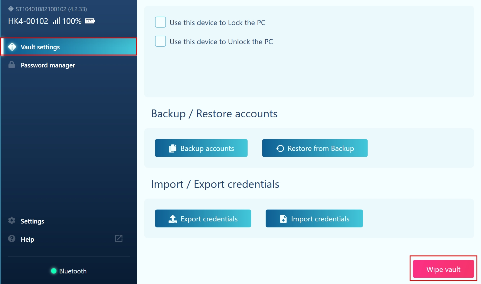 In order to wipe the device, go to the Vault settings section and click the Wipe button at the bottom of the page.