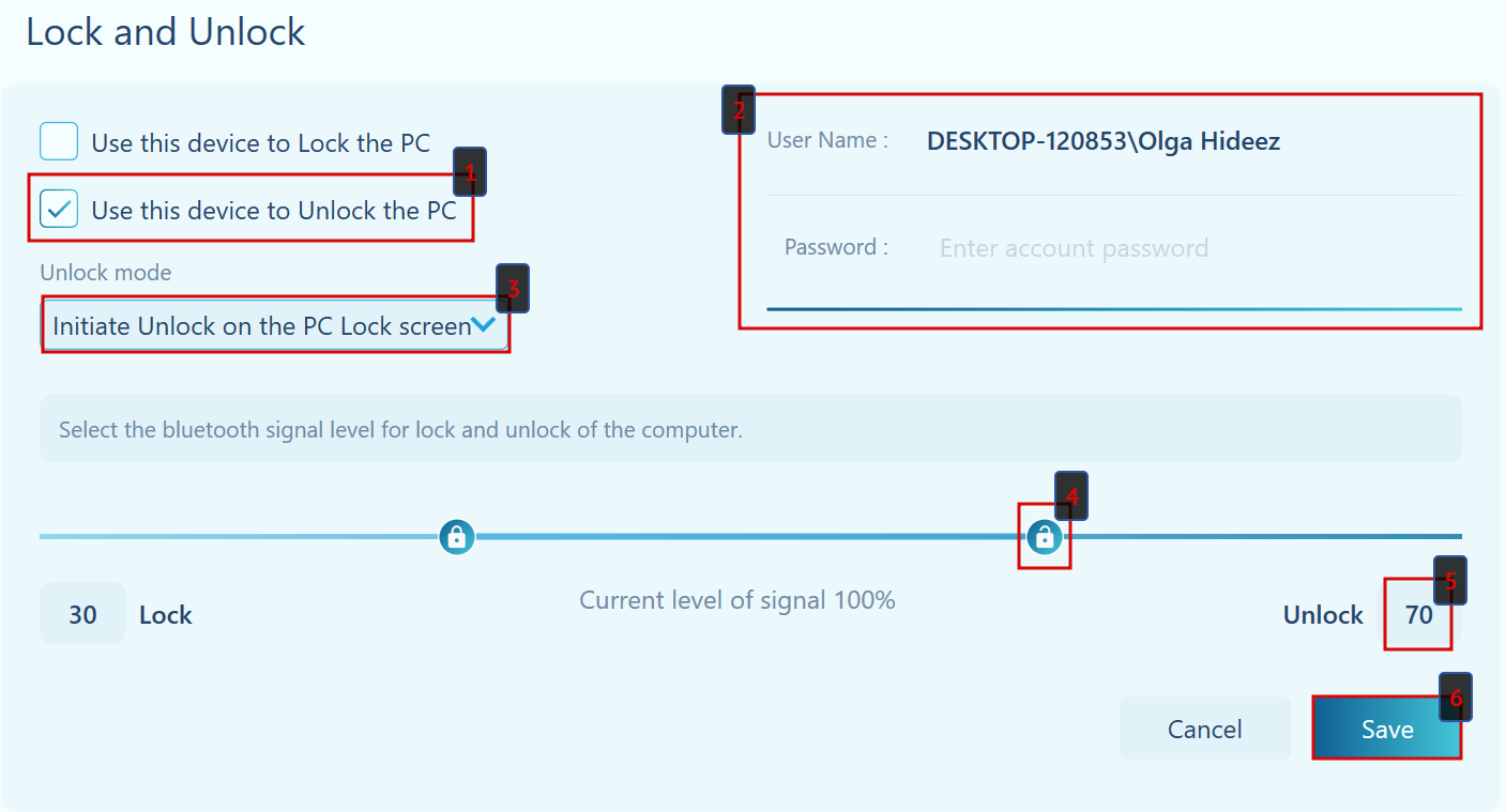 Unlocking the PC only by the proximity mechanism. As soon as the Bluetooth signal level exceeds the set value in %, your PC will be unlocked.
