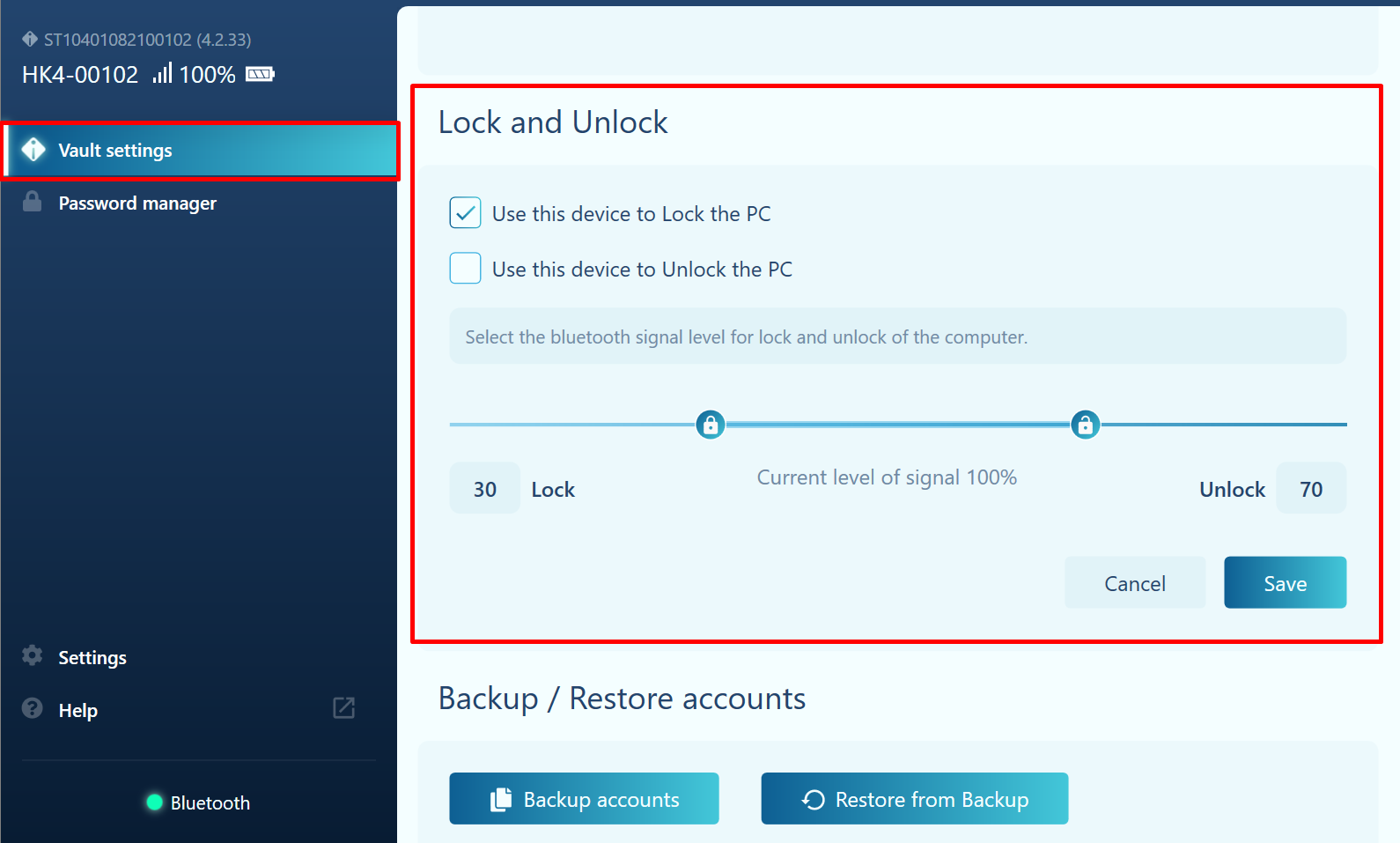 Go to the Vault settings section and the Lock and Unlock block to configure Proximity settings. Check the Use this device to Lock the PC checkbox. The Proximity level setting appears.